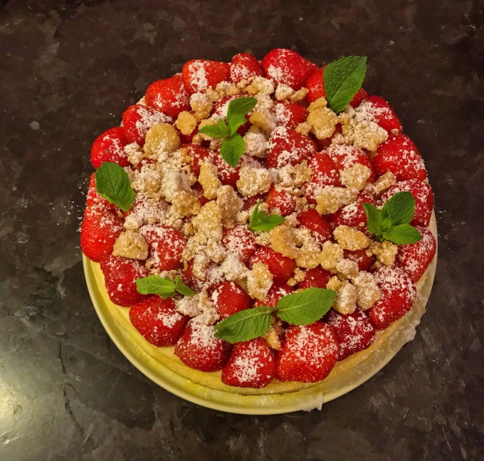 Was das Rezept angeht, ich habe ein paar Stunden gebraucht, um ein fantastisches Cheesecakerezept zu finden. Was ich getan habe, ich habe mir für den Stream etwas Lektüre bestellt, wo es hauptsächlich um das Thema „Cheesecake“ ging. Die letztendliche Entscheidung war dann diese, dass ich auf ein Rezept von meinem Lieblingspatissier Christian Hümbs zurückgegriffen habe. Basis von einem Streuselteig und einer extrem kremigen und abgerundeten Cheesecakemasse. Original kam allerdings ein Passionsfruchtgelee darauf, aber da ich ja mit Erdbeeren arbeiten wollte, habe ich dies einfach so angepasst, dass es letztendlich auch passt. Crumble und Minze sorgten dann für den letzten Schliff.