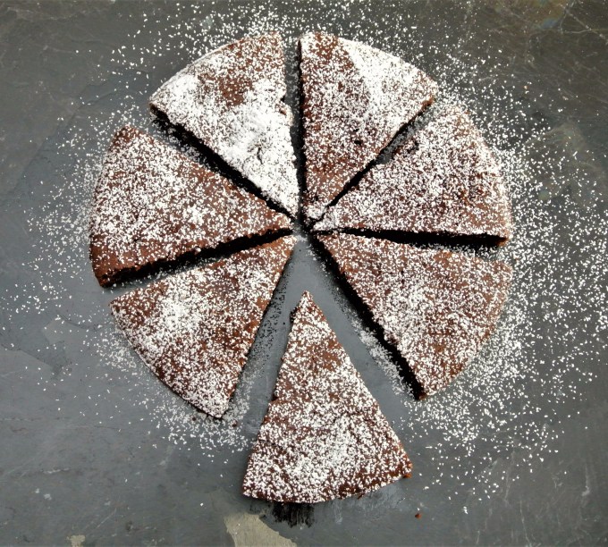 Den abgekühlten Kuchen in gleichmäßige Stücke schneiden und mit Puderzucker abstauben.