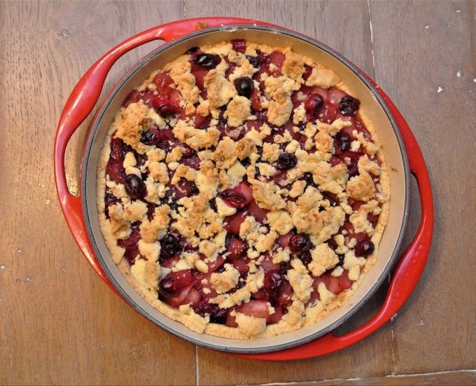 Aus dem restlichen Teig unterschiedlich große Streusel formen und auf die Pie gleichmäßig verteilen. Zum Schluss mit ein paar Cranberry belegen. Somit herrscht nochmal etwas Abwechslung und Spannung. In den vorgeheizten Backofen schieben und ca. 15-20 Minuten backen, bis der Rand und die Streusel eine goldbraune Farbe bekommen haben. Aus dem Ofen nehmen und auskühlen lassen.