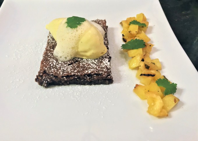 100ml Ananassaft und 2 EL Sojalecithin. Beides mit einem Stabmixer ordentlich mixen, bis eine standhafte Luft entsteht. Diese dann zum Schluss mit anrichten. Ein paar Korianderblättchen verteilen – fertig. Und ja, den Brownie habe ich auch mit etwas Puderzucker abgestaubt, sieht aus meinem Blickwinkel immer etwas schöner aus – muss man aber nicht machen 🙂 .