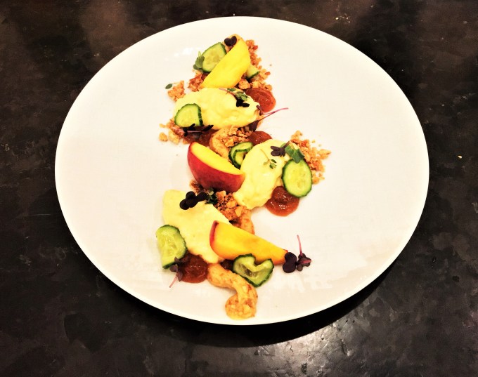 Somit sind alle Parts hergestellt und man kann anrichten. Wie ihr letztendlich anrichten wollt, überlasse ich euch. Denn jeder hat ja eine andere Sichtweise von „schön anrichten“. Für meinen Teil bin ich super zu Frieden mit dem, was ich da gekocht und gebacken habe. Es war ein ganz verrücktes Projekt, ja anders kann man das nicht sagen. Doch es hat super viel Spaß gemacht. Gerade auch super spannend, mit dem geräucherten Pfirsich. Habe ich zuvor noch nie gegessen, war aber doch ganz glücklich, dass ich es getan habe. Weil es meiner Meinung nach super interessant und spannend war – und ja, dass meine ich alles positiv 🙂 .